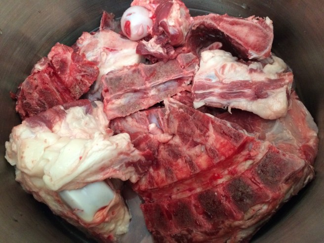 • We used 9 lbs total of meaty pork neck and femur bones. The meat was $3/lb, ordered in advance and ready in about 9 days. Femurs must be at a real premium, because although we asked for a mix of half neck bones and half femurs, I only counted two femurs in the bunch.