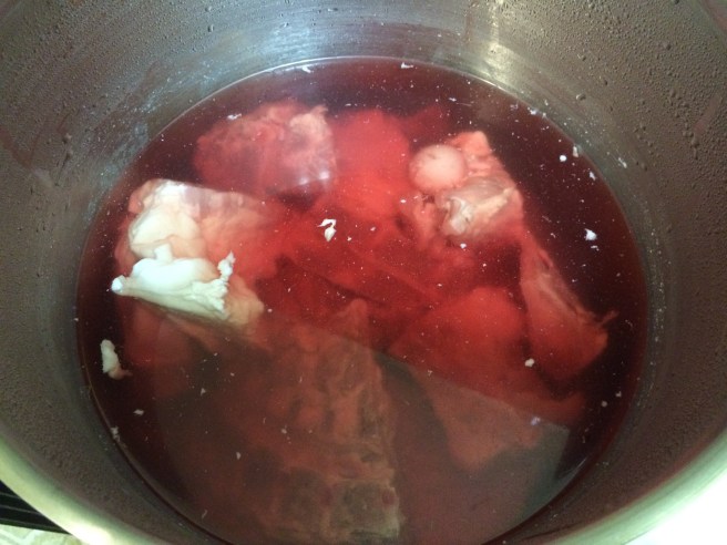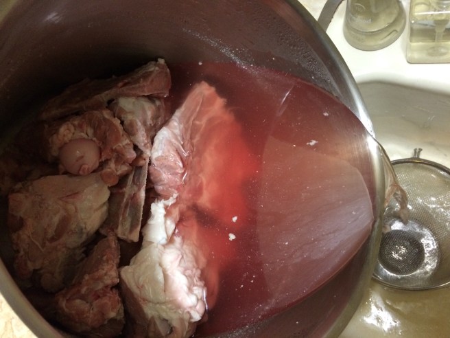 • There was less dark matter and coagulated blood to clean within the bones than I had expected to encounter, especially since most of the descriptions of this step had called for using chopsticks (which I imagine would mean poking & picking at veins and such). The majority of the cleaning was simply rubbing away the coagulated material. Rinsing under cold running water didn’t help loosen much.