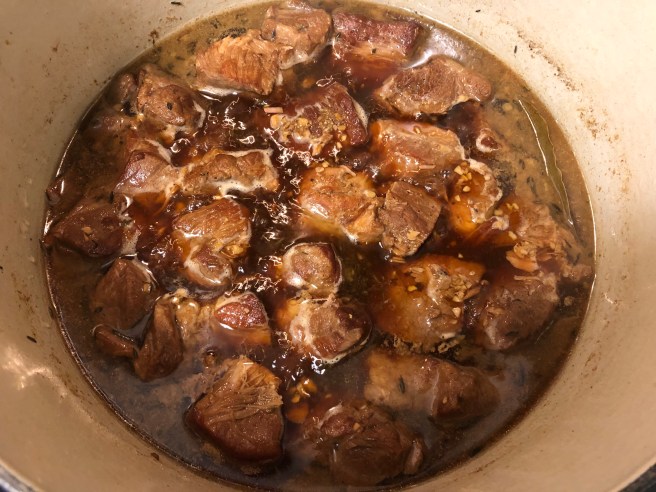 - Heat oil in a heavy pot such as a dutch oven. Working in batches (1 lb at a time) sear the pork to brown on all sides.