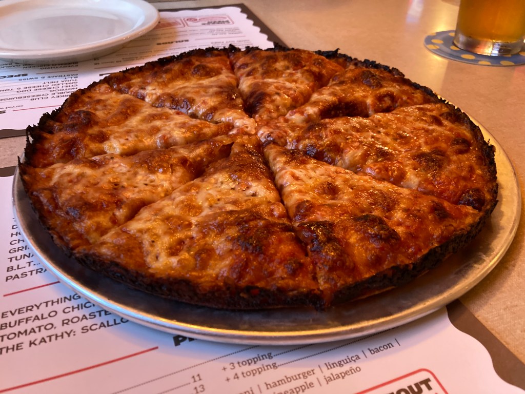 South Shore Bar Pizza is a phenomenon on the South Shore of Boston. It is a 10″ pie, some might say it has a thin crust, and is characterized by lacey burnt edges. The lacing comes about when the sugars in the tomato sauce sizzle and intermingle with the cheese against the side of the steel pan as it bakes. These pies tend to either have a more cracker-like, or a thin foccaccia-like, dough.